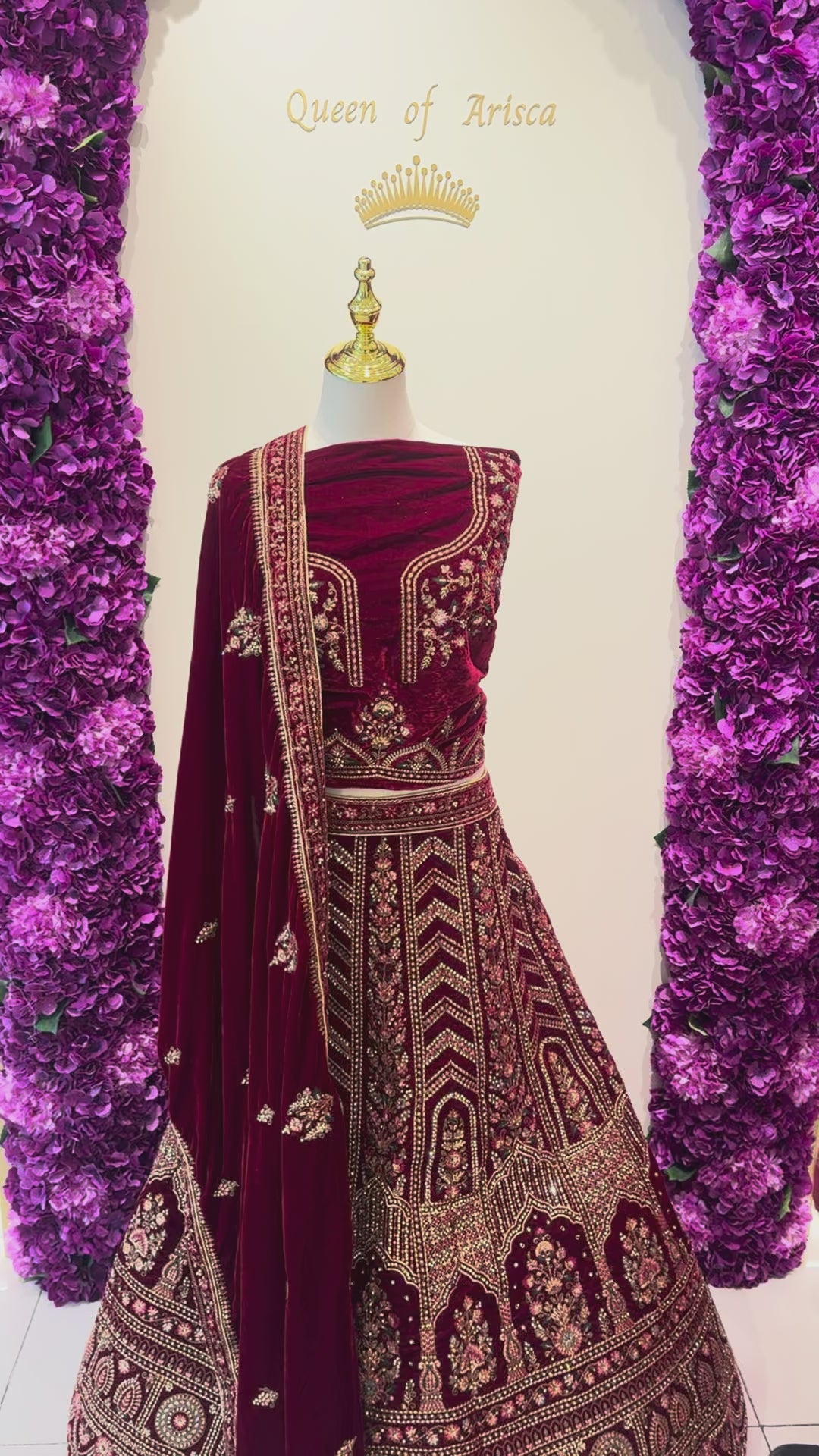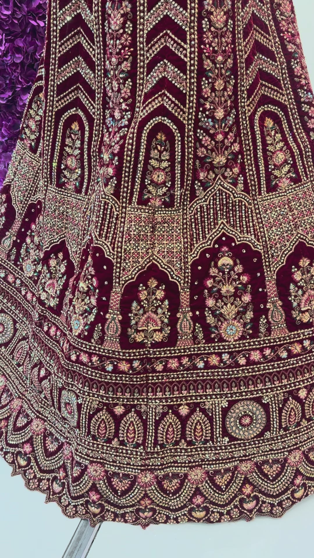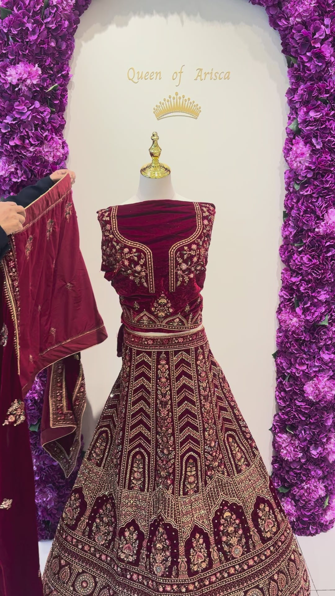 Make a grand and unforgettable entrance with our Luxury Maroon Heavy Embroidered Lehenga, designed for weddings and special occasions in Qatar. This stunning party wear lehenga features intricate gold embroidery with detailed threadwork and rich embellishments across the skirt and blouse.