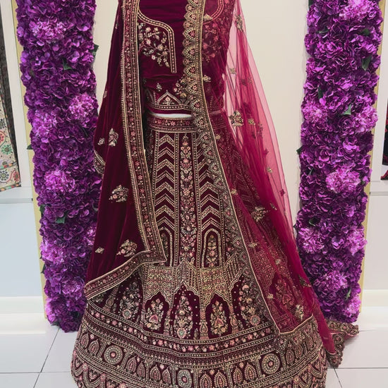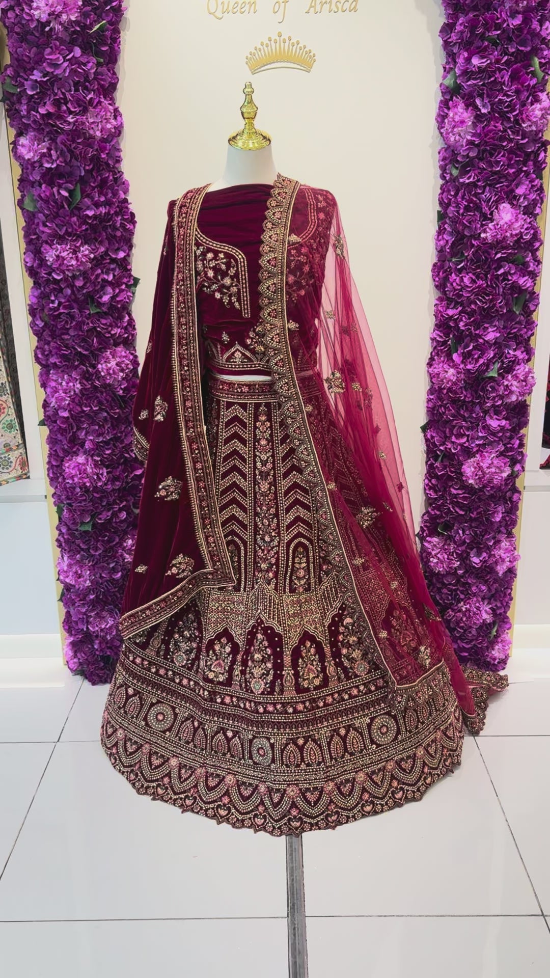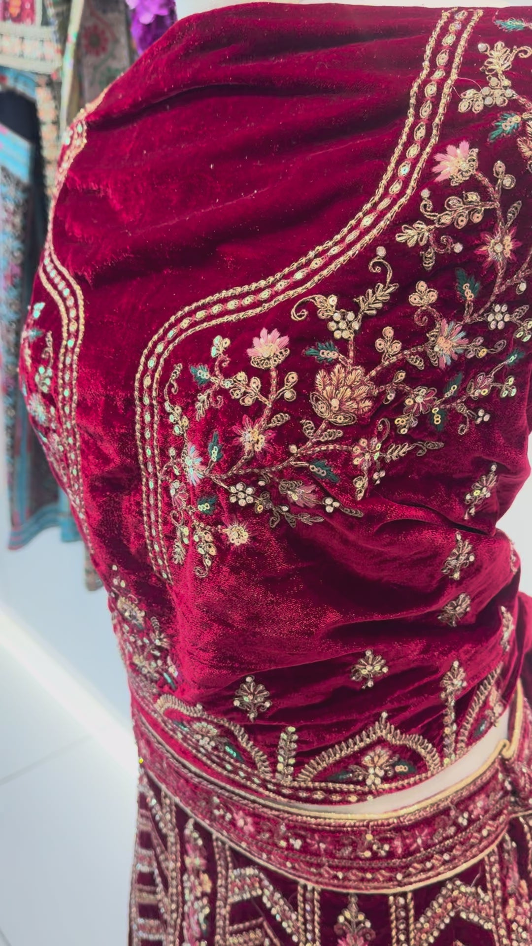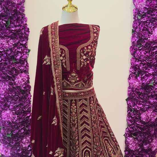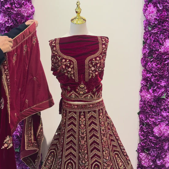 Make a grand and unforgettable entrance with our Luxury Maroon Heavy Embroidered Lehenga, designed for weddings and special occasions in Qatar. This stunning party wear lehenga features intricate gold embroidery with detailed threadwork and rich embellishments across the skirt and blouse.