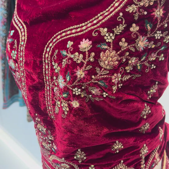 The deep maroon shade reflects elegance and tradition, making it ideal for receptions, engagement parties, bridal events, and Eid celebrations in Doha. The structured blouse enhances the silhouette, while the soft embroidered net dupatta adds grace and sophistication.