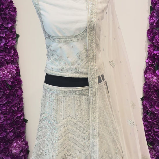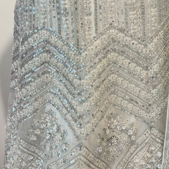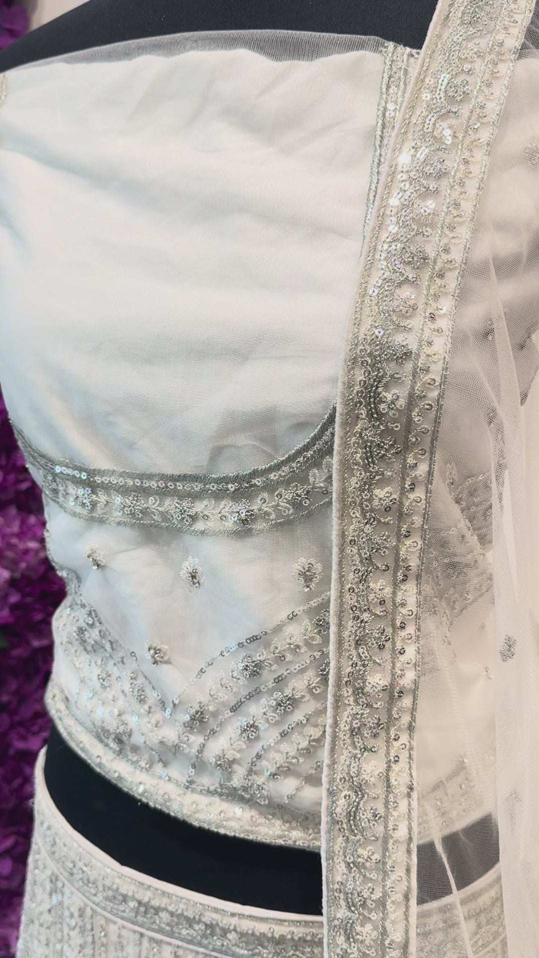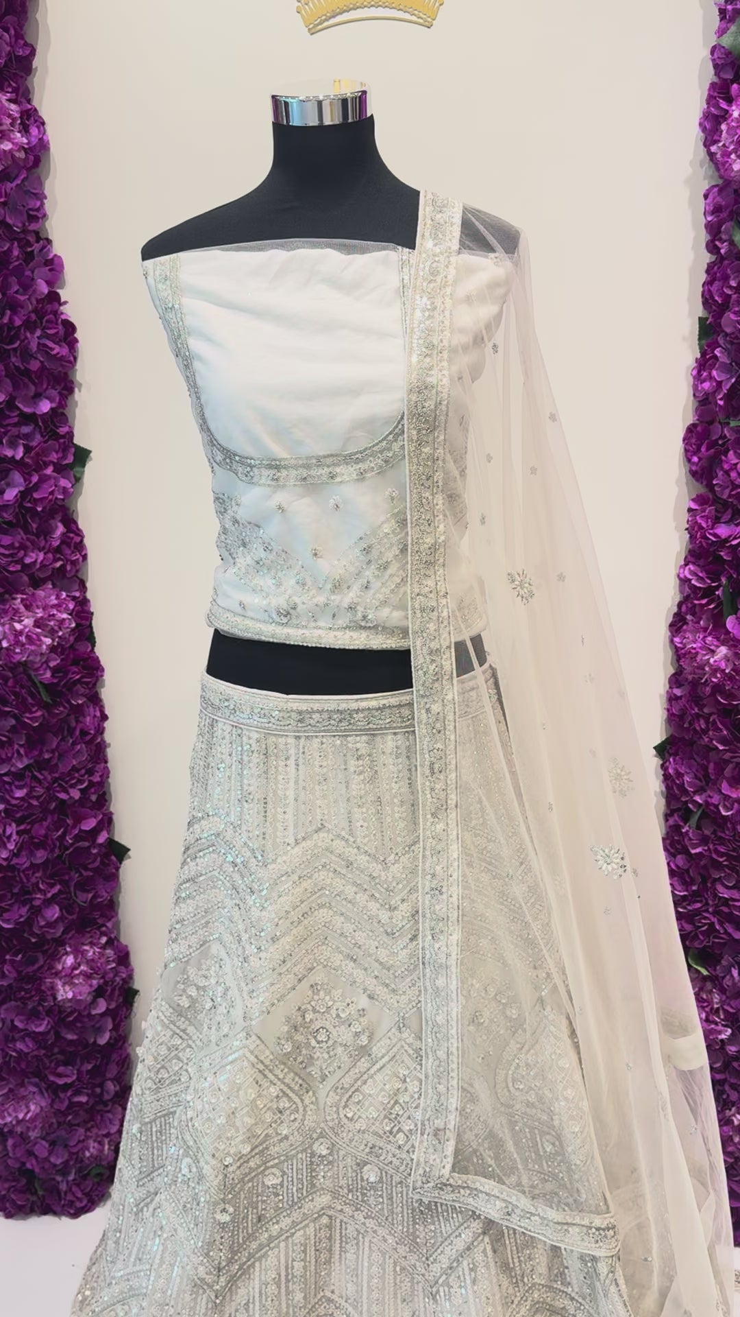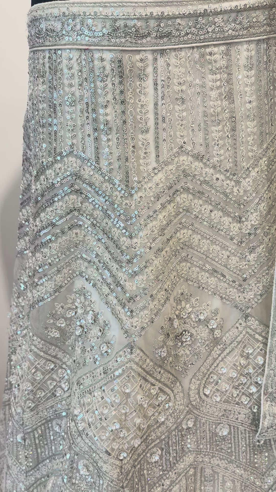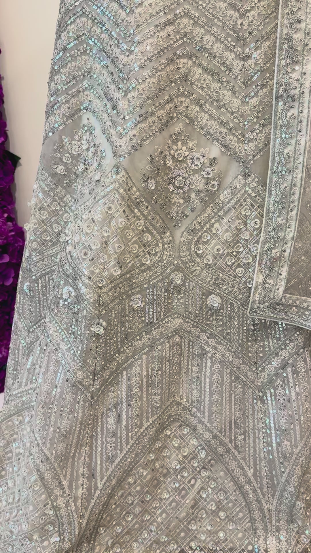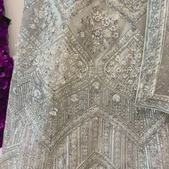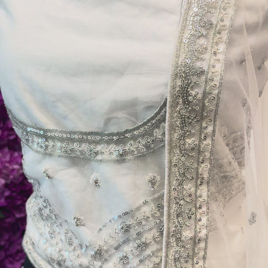 This stunning lehenga features intricate silver embroidery and delicate handwork on premium fabric, giving it a rich and royal finish. The blouse is beautifully designed with detailed embellishments, perfectly matching the heavily embroidered flared skirt. The soft net dupatta with fine border work adds a dreamy and feminine touch to the complete look.